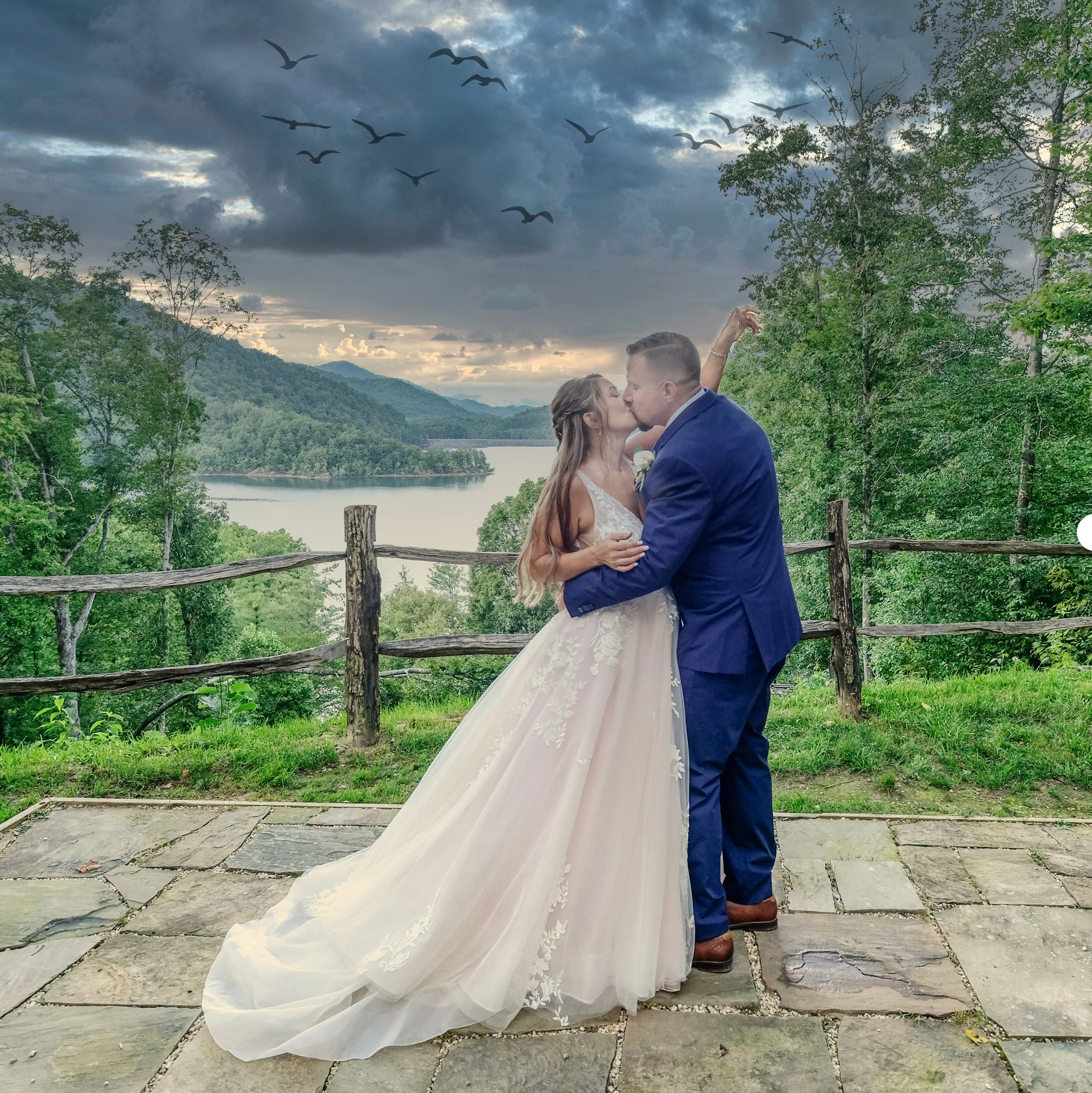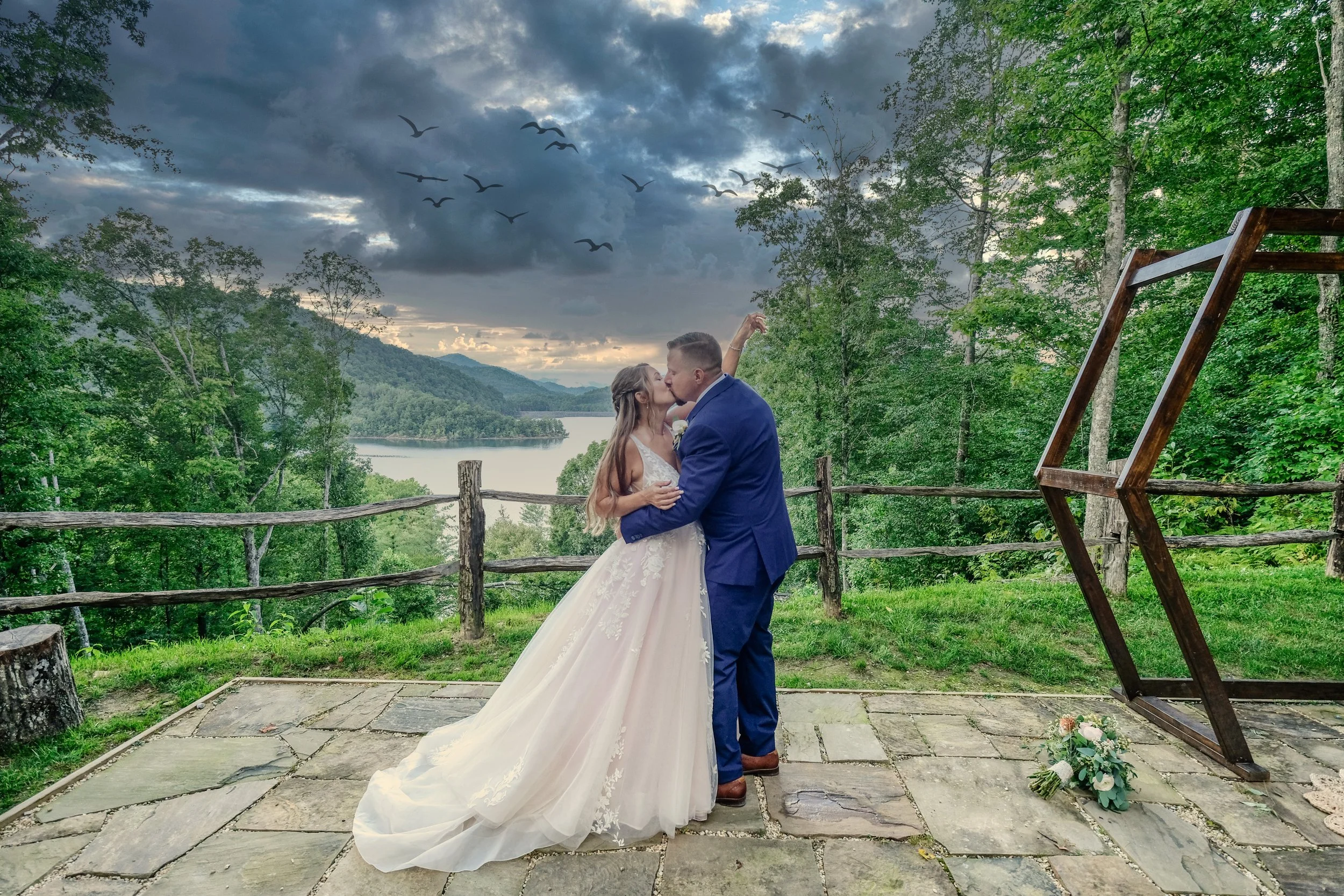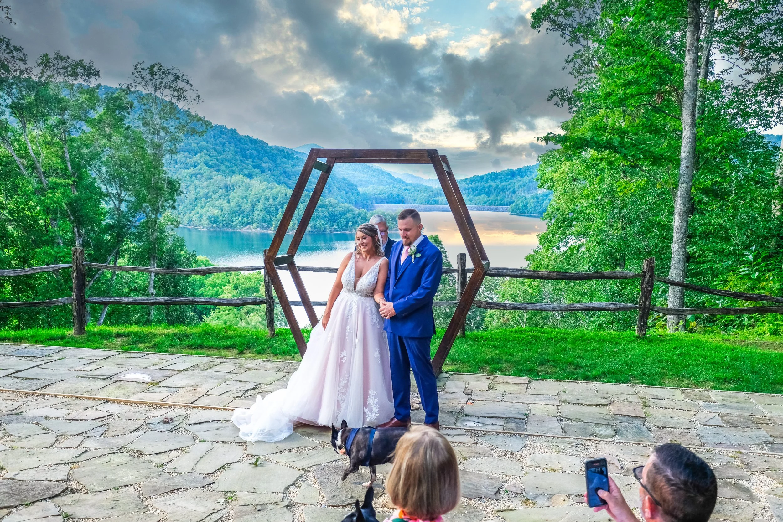 A bride and groom standing together at a wedding ceremony outdoors by a lake with mountains in the background, framed by a wooden geometric structure. The bride is wearing a white lace wedding dress, and the groom is in a blue suit. An officiant stan
