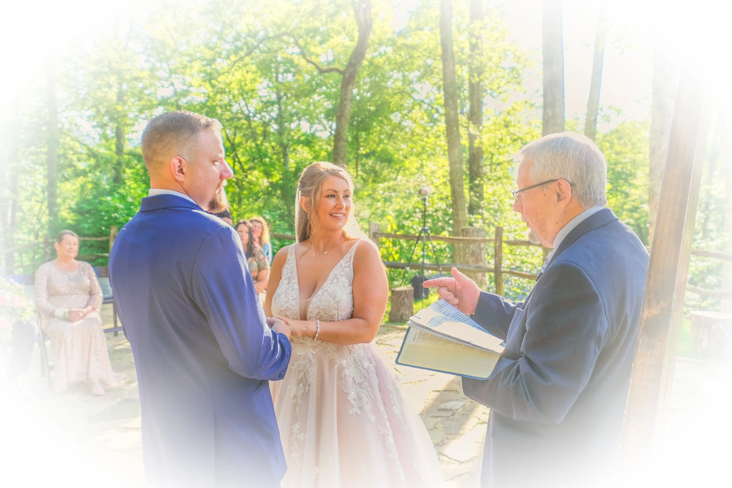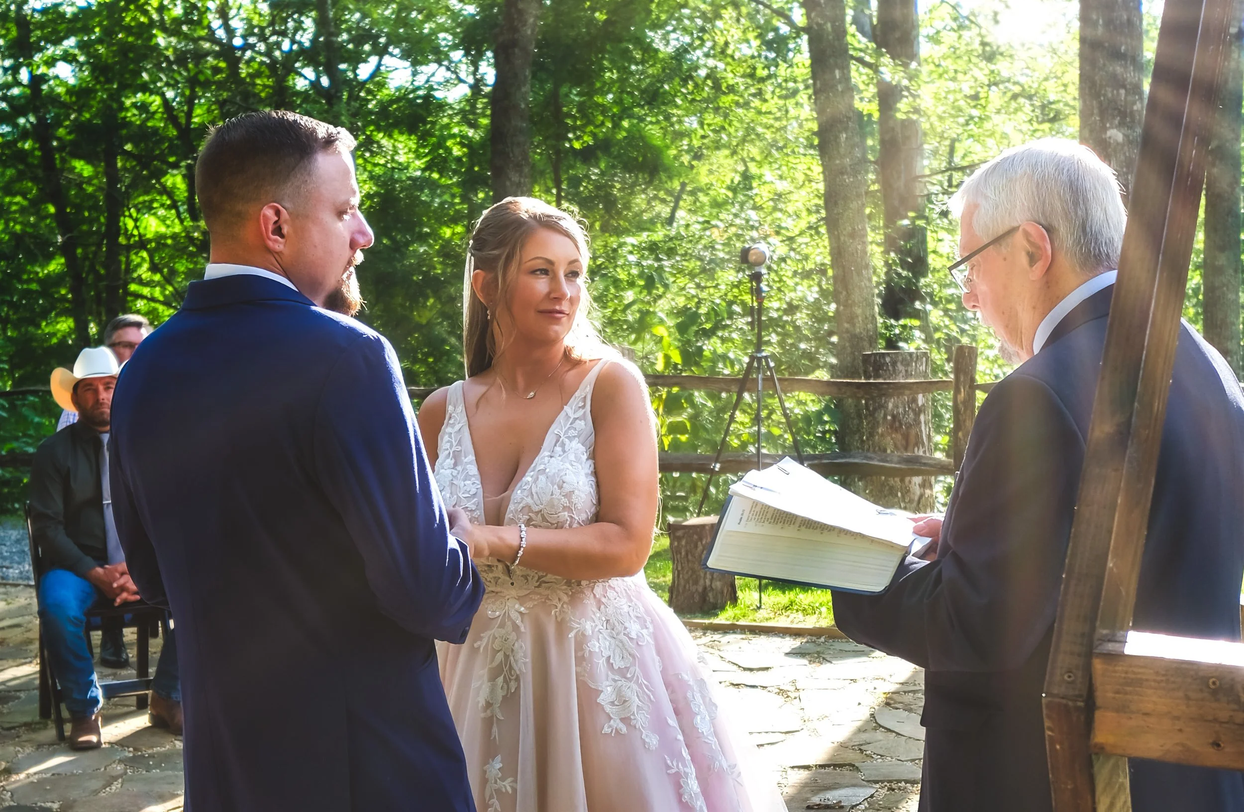 A bride and groom exchange vows during an outdoor wedding ceremony in a wooded area, with a officiant reading from a book.