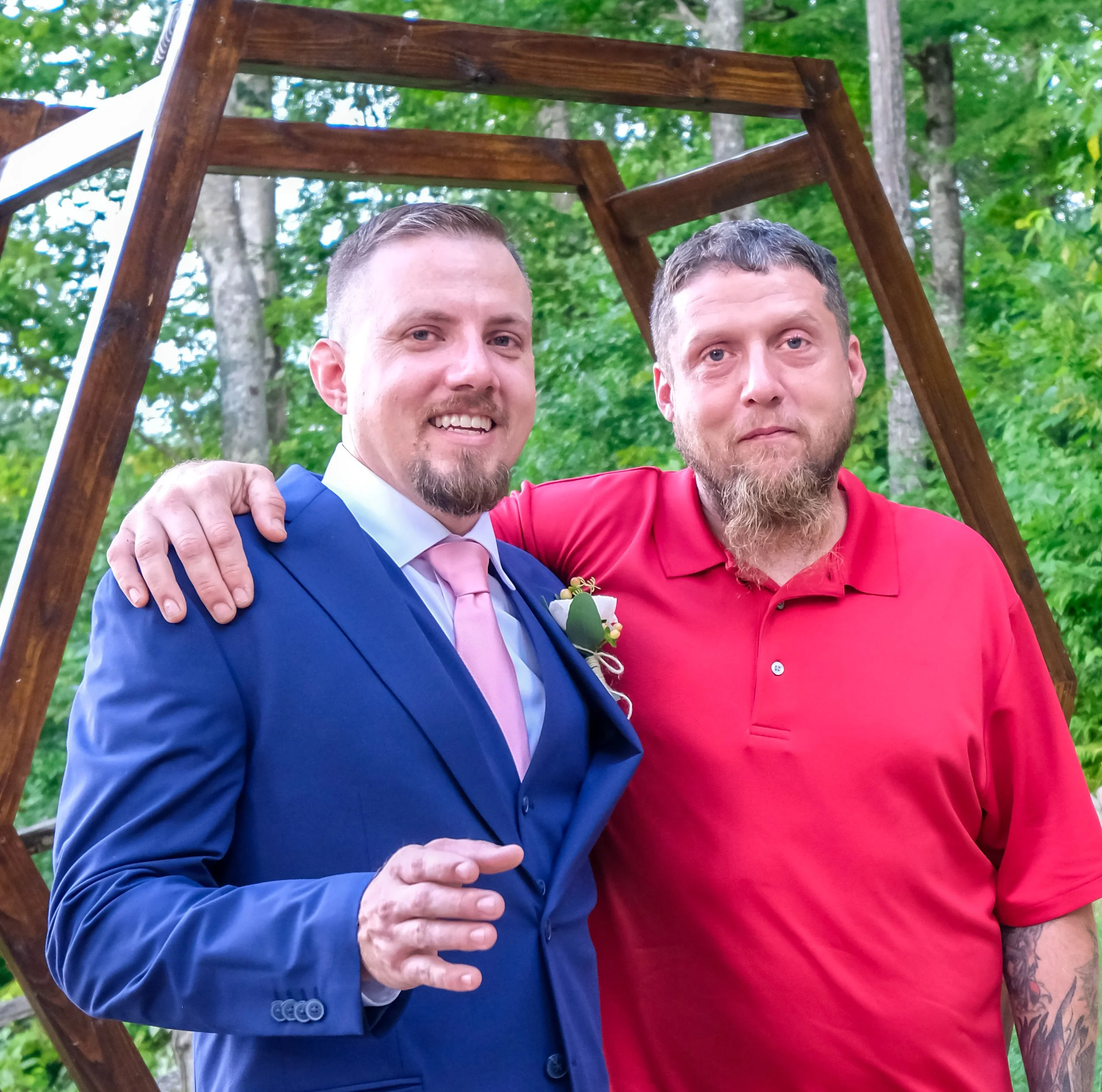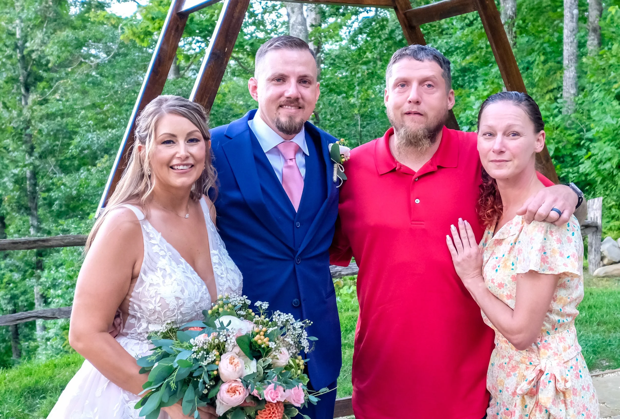 Four people standing outdoors at a wedding, with a wooded background and wooden structure. The woman on the left is wearing a white wedding dress and holding a bouquet, the man next to her is in a blue suit with a pink tie, the man beside him is in a