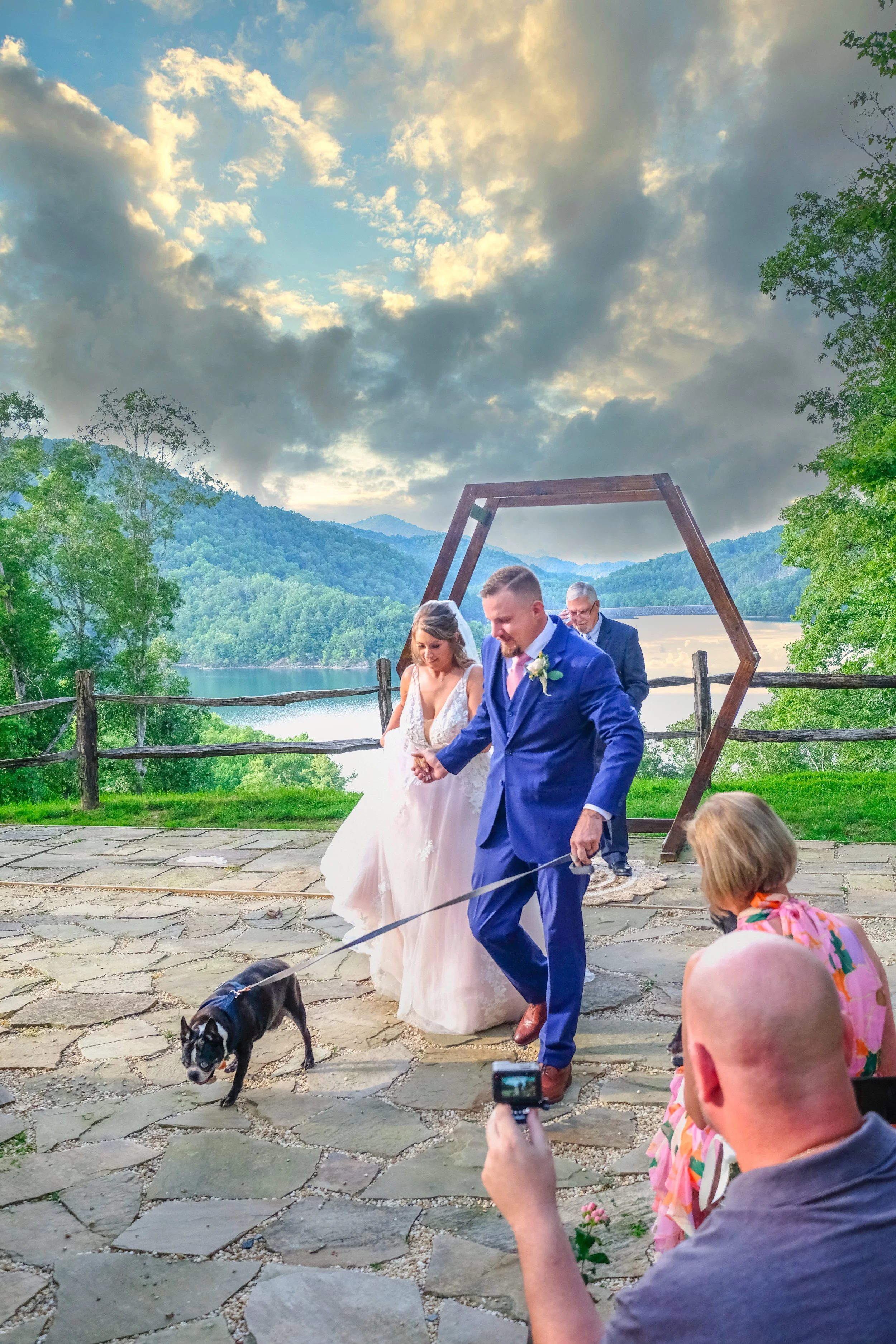 A couple, the groom in a blue suit and the bride in a white wedding dress, walking hand in hand outdoors during a wedding ceremony with an officiant behind them. They are holding a leash attached to a small black dog. The background features a lake,