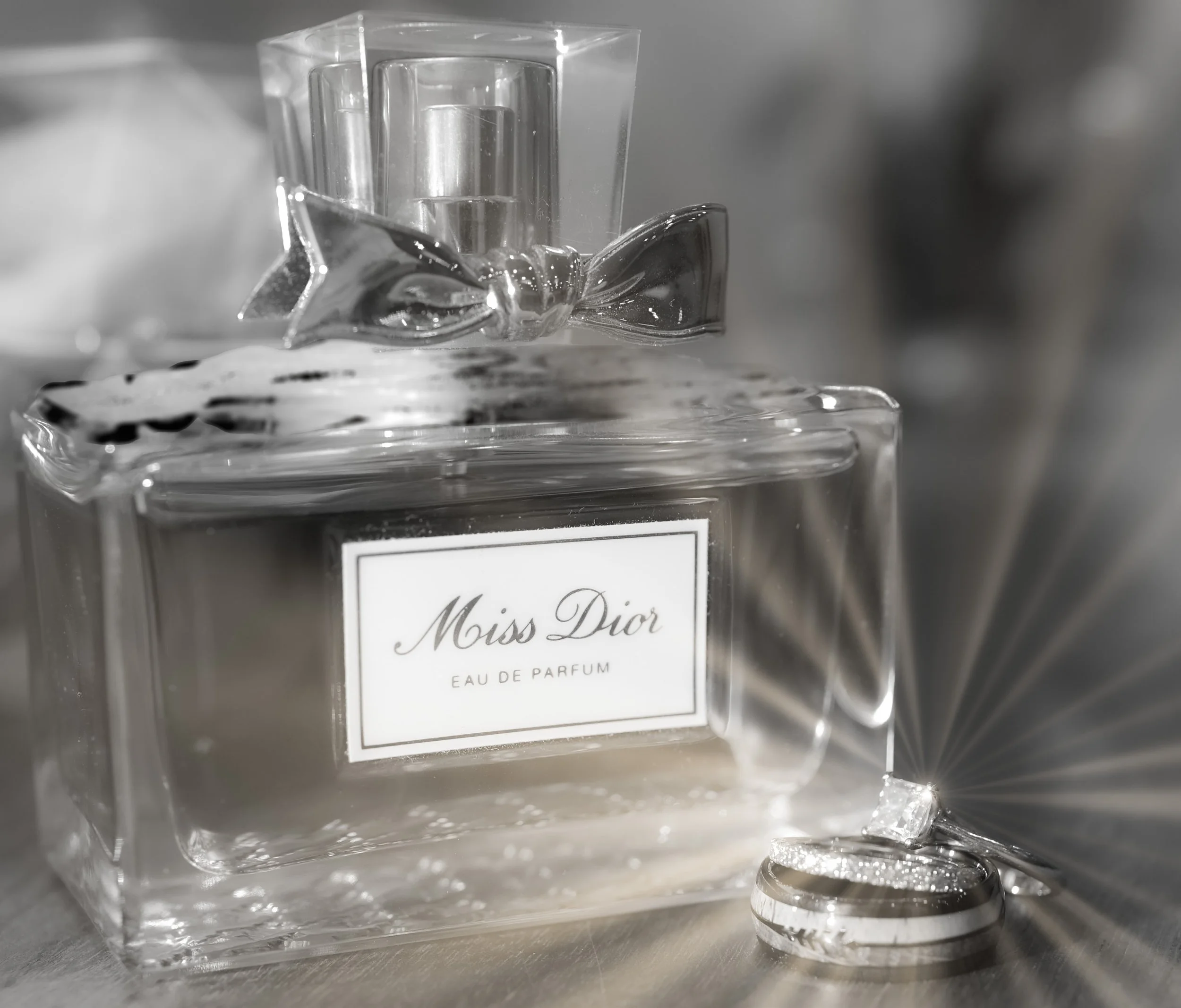 An older woman in a gold, sequined dress smiling and standing next to an older man in a navy suit with a pink shirt and boutonniere, outdoors in front of a forested background.