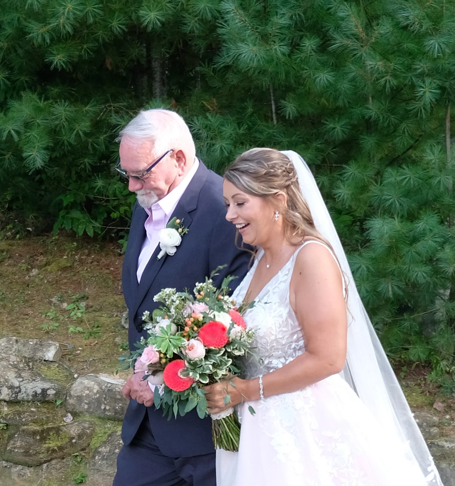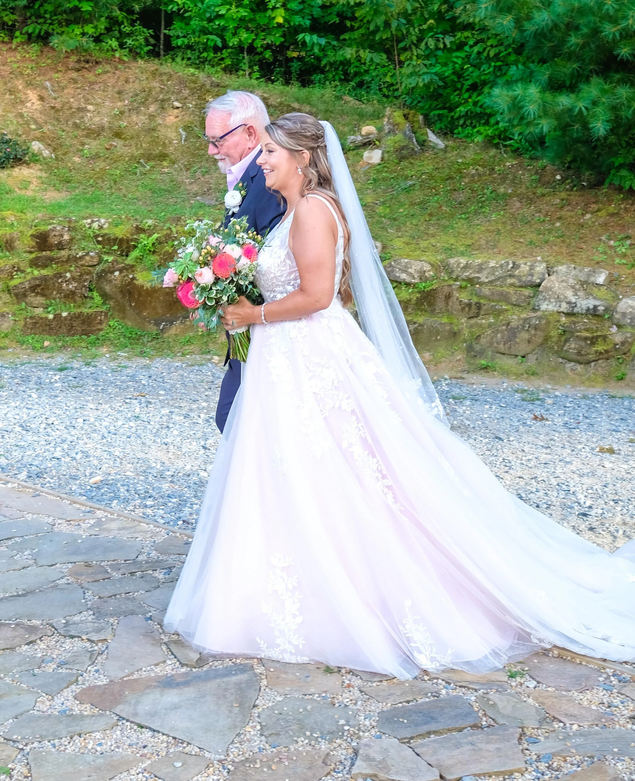 Bride in a white wedding dress holding a bouquet walking with an older man in a suit outdoors with trees and a shed in the background.