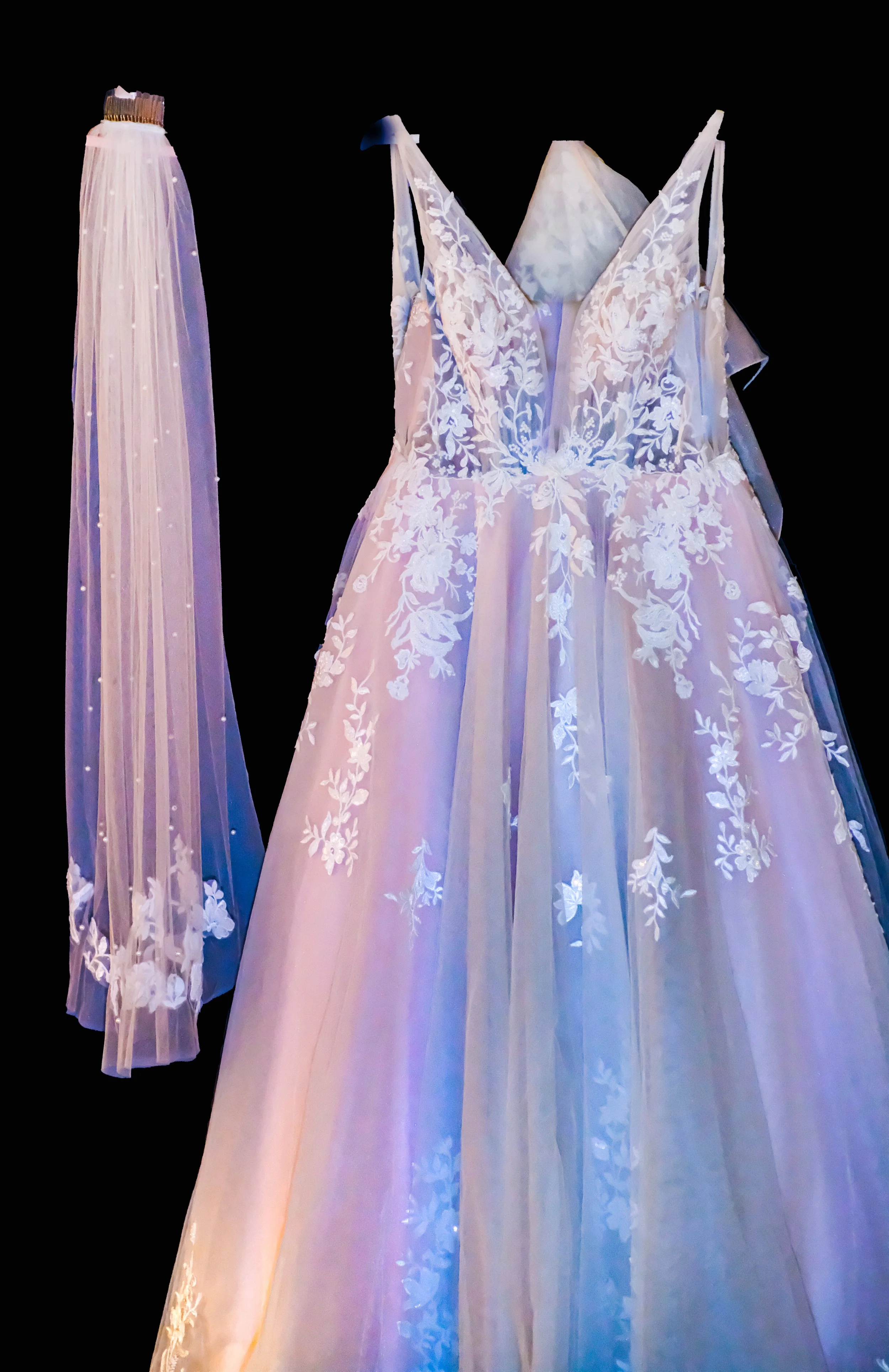 Bride and groom walking outdoors in a wooded area, with the bride wearing a white wedding dress and veil, and the groom in a blue suit, holding the leash of a small black dog.